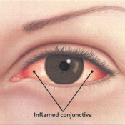 Viral infection is the most common cause of conjunctivitis. This is the same virus that produces the familiar red and watery eyes, runny nose and sore throat usually associated with the common cold. Symptoms of conjunctivitis can last from one to two weeks and will then disappear on their own. Discomfort can be alleviated with warm compresses. Eyedrops may also be prescribed by your doctor to minimize drainage or discomfort.